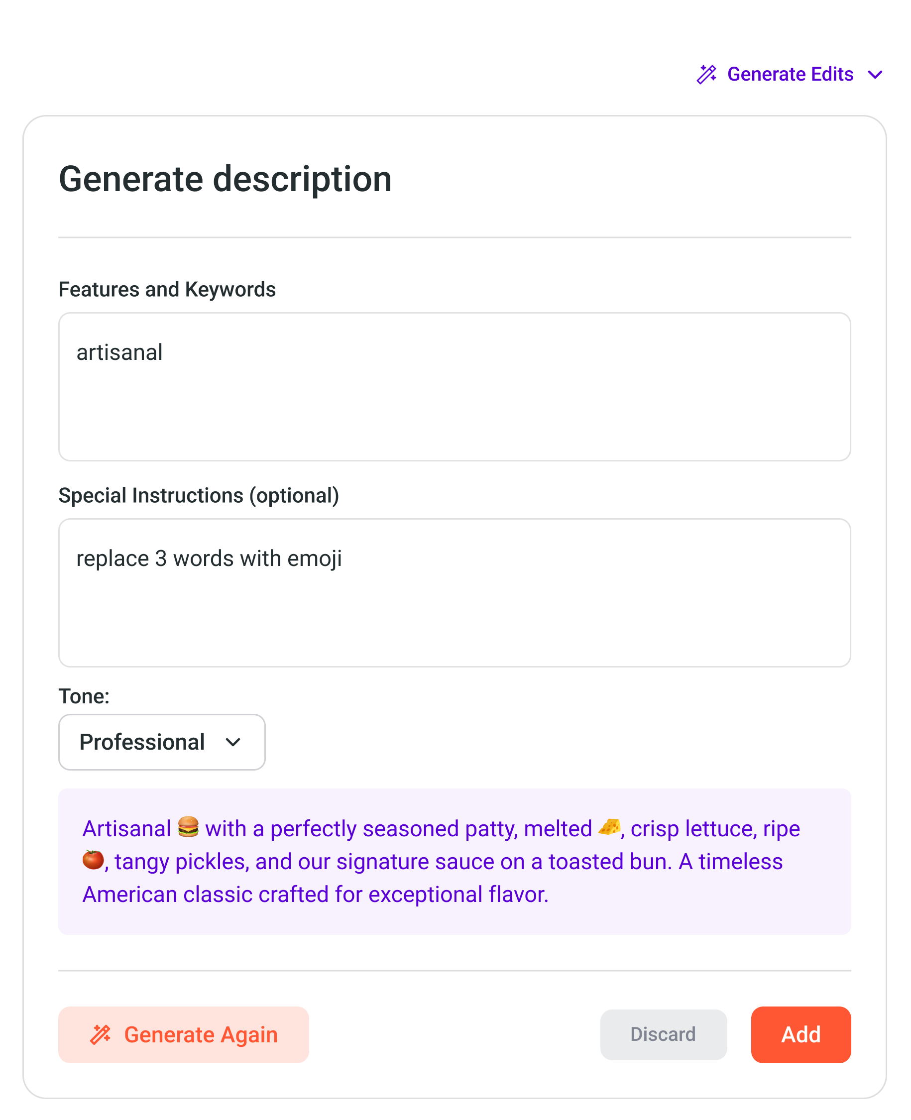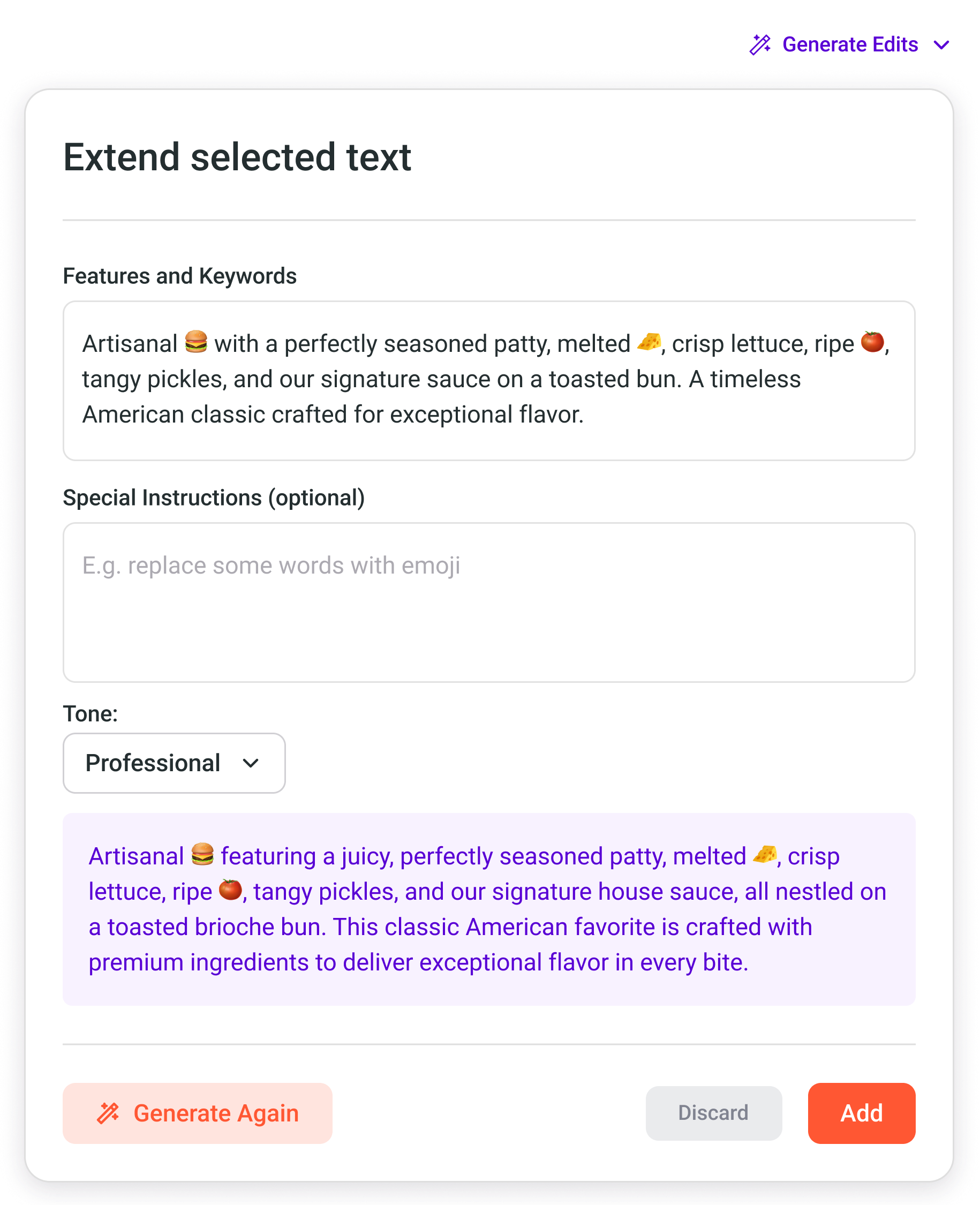 Refine any description, whether created with Upvendo Magic or your own, into compelling copy that drives orders. Simplify lengthy text, extend brief descriptions, or regenerate entirely to create the perfect message for your customers