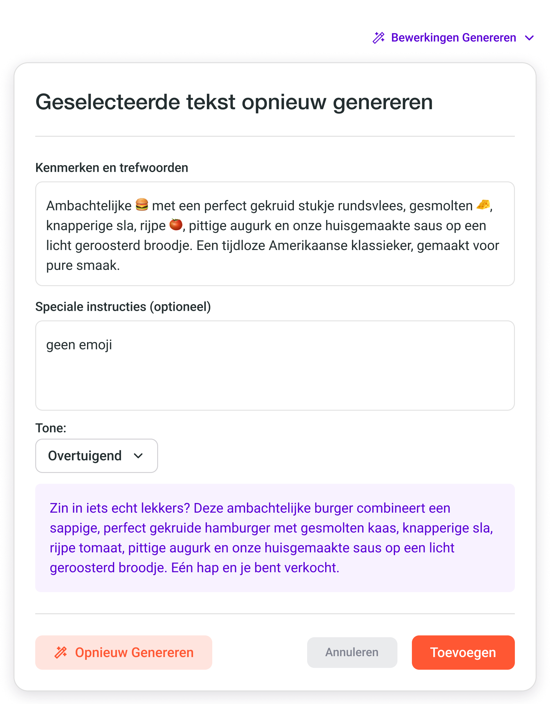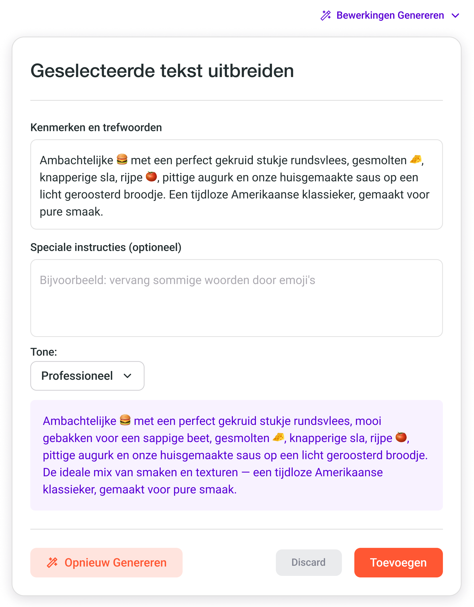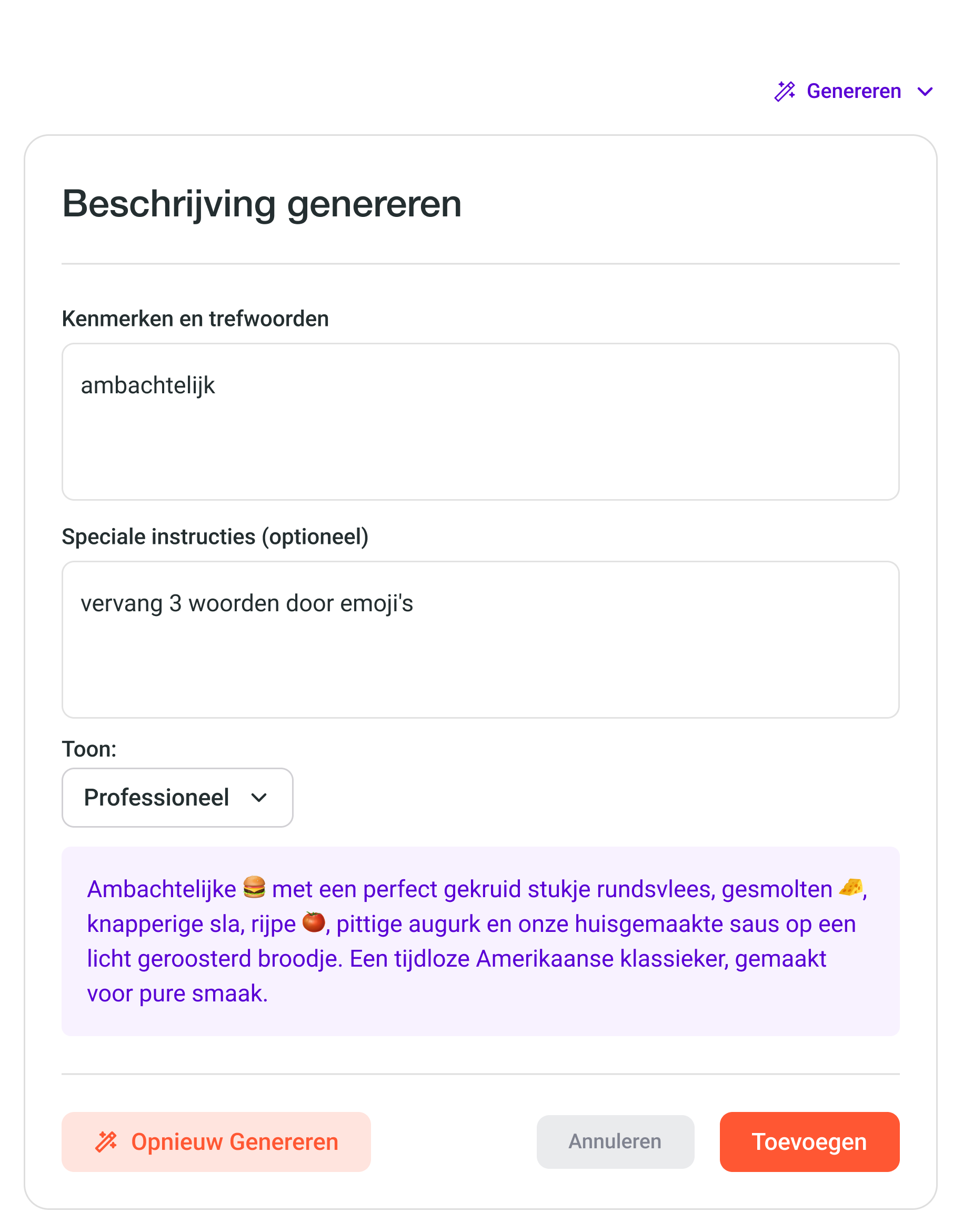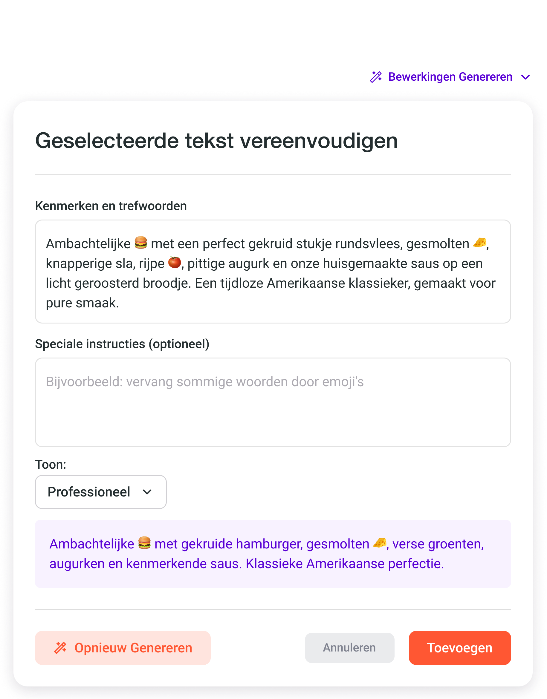 Zeker. Je kunt elke beschrijving vereenvoudigen, uitbreiden of volledig opnieuw genereren met één klik. Upvendo Magic geeft je volledige creatieve controle, terwijl je menuteksten toch consistent en professioneel blijven.