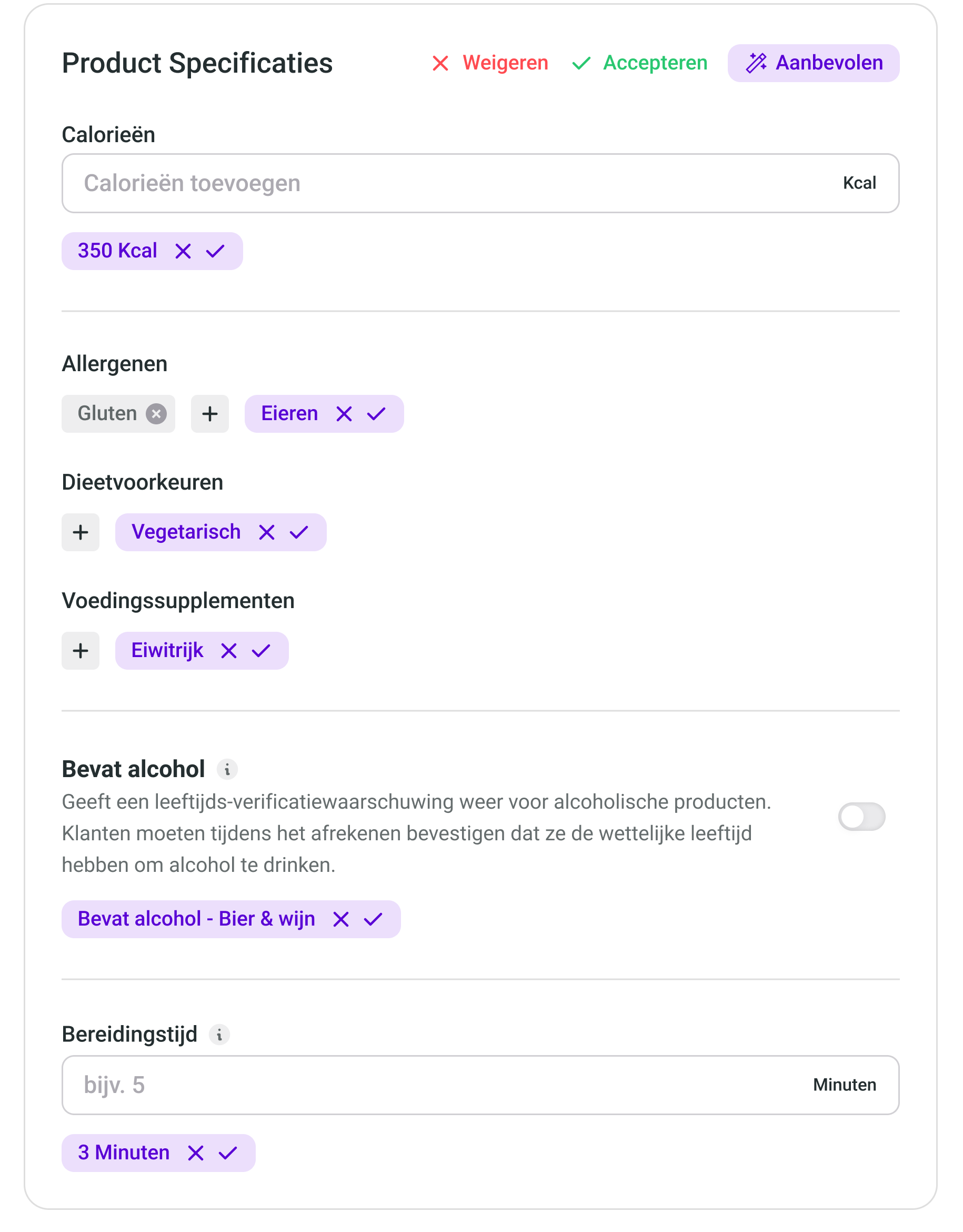 Magic Suggestions detecteert automatisch allergenen, dieetvoorkeuren en voedingsdetails op basis van je kassadata. Je kunt alles eenvoudig nakijken en goedkeuren voor publicatie, zodat de informatie overal correct en in regel is.